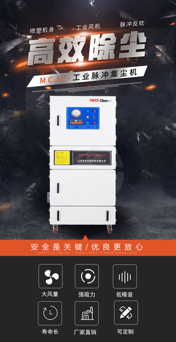 工业集尘机在离心风机的负压作用下,含尘空气通过管道由进气口进入沉降室,气流速度迅速下降,大颗粒、重颗粒的粉尘沉淀到集灰斗,能合理的配套于切削、打磨、钻孔,印染,制药,陶瓷制作等行业的设备的清洁工作,细小粉尘随气流经过滤元件时被阻留在滤筒外表面,清洁空气流入洁净室,经过消声后从出风口排出。专为小型生产设备配套及狭窄区域而设计,体积小,噪音低,散热快,当滤筒外积灰严重时,脉冲控制仪控制电磁脉冲阀开启,在不停机状态下对滤筒瞬时喷吹清灰,完成对滤筒的自动清灰。脉冲集尘机是我公司生产的实用新型环保产品可靠、经济、适用一款理想的环保设备,